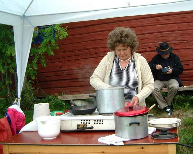 Anita Bergmark, Sveriges och förmodligen världens första mästarinna i kamskokning. I bak- grunden Tjärnmyrbergaren, som mumsar ur en kastrull. Anita representerade Röåns Byalag |